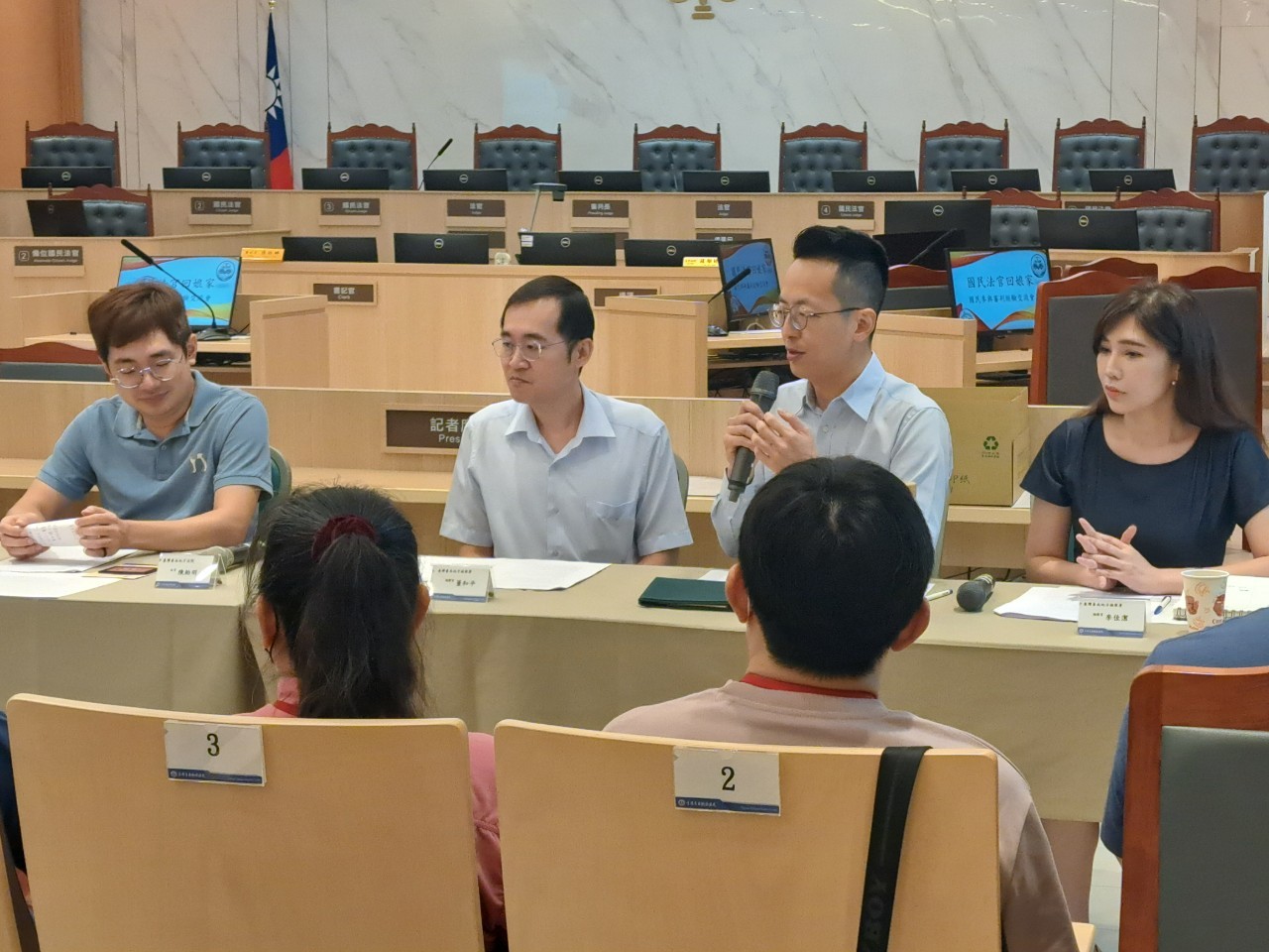 為表達歡迎之意,本院沈揚仁院長親臨會場致詞,並慰勉國民法官及審、檢、辯的付出及辛勞。本次活動亦由國民法官庭陳本良庭長擔綱主持,參與情形熱烈踴躍,除了16位國民法官、備位國民法官外,臺灣臺南地方檢察署負責國民參與審判案件之董和平檢察官、李佳潔檢察官、莊士嶔檢察官以及實際參與國民參與審判案件辯護之伍安泰律師、林泓帆律師、鄭婷婷律師、謝育錚律師及葉進祥律師,均撥冗共襄盛舉。