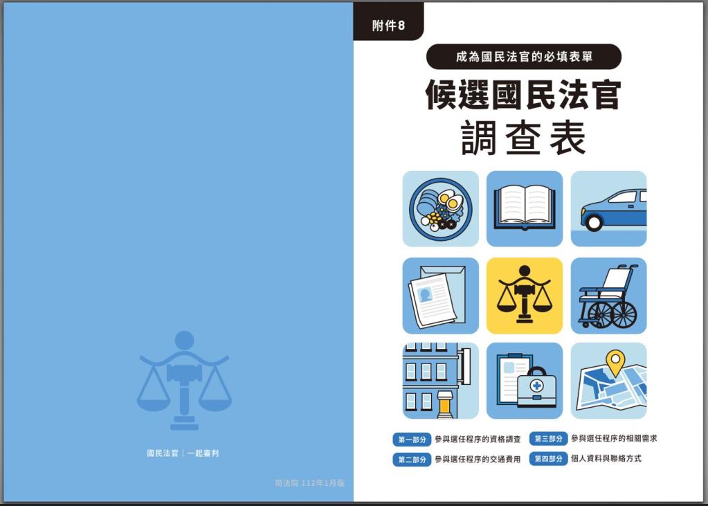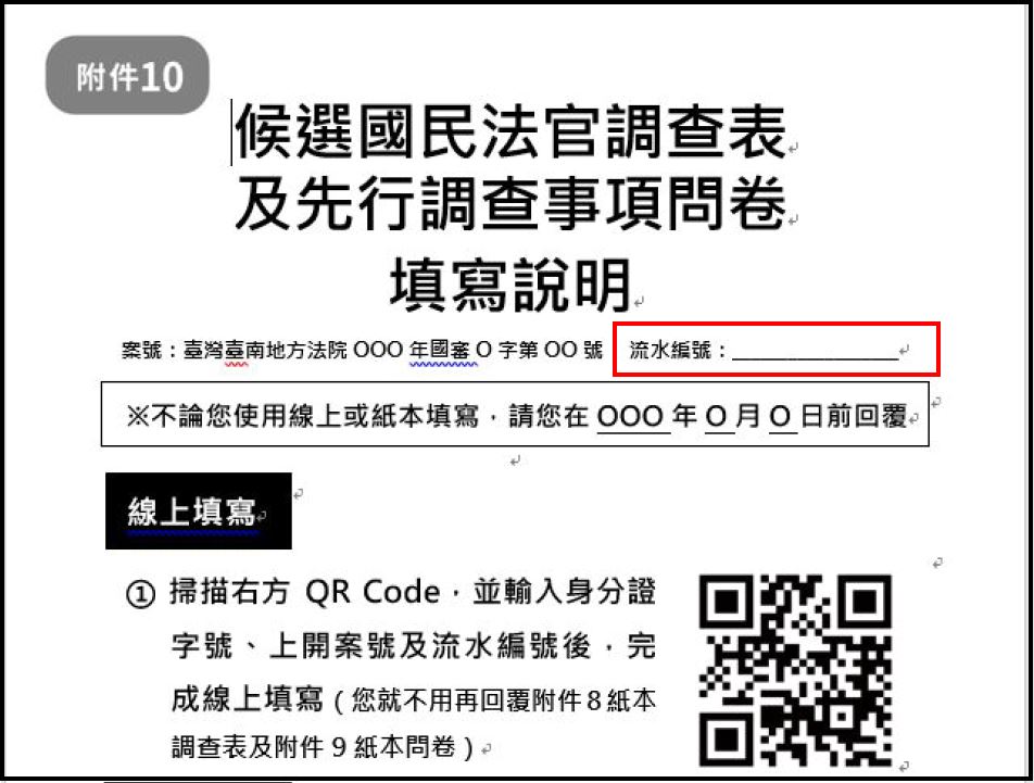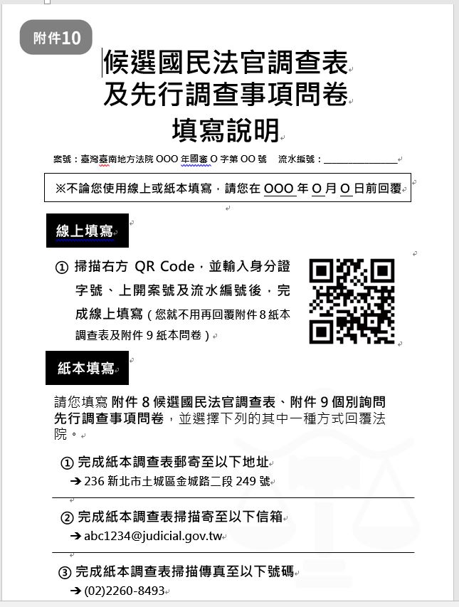 民眾若收到「附件8-候選國民法官調查表」(圖1),想採用線上填寫,也可透過以下方式進行填寫: